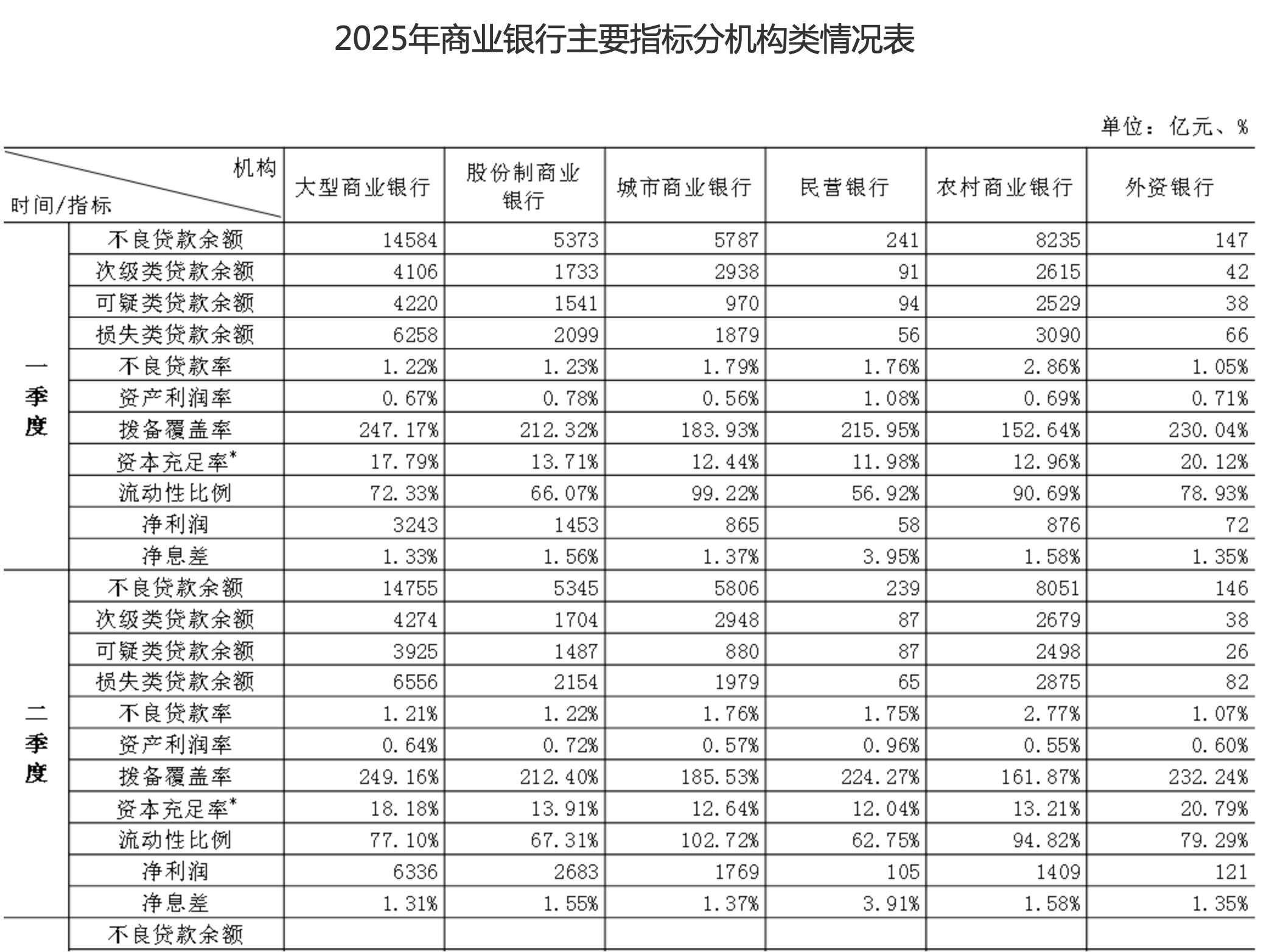 2025年二季度末,商业银行(不含外国银行分行)资本充足率3为15.58%,较上季末上升0.30个百分点;一级资本充足率3为12.46%,较上季末上升0.28个百分点;核心一级资本充足率3为10.93%,较上季末上升0.24个百分点。